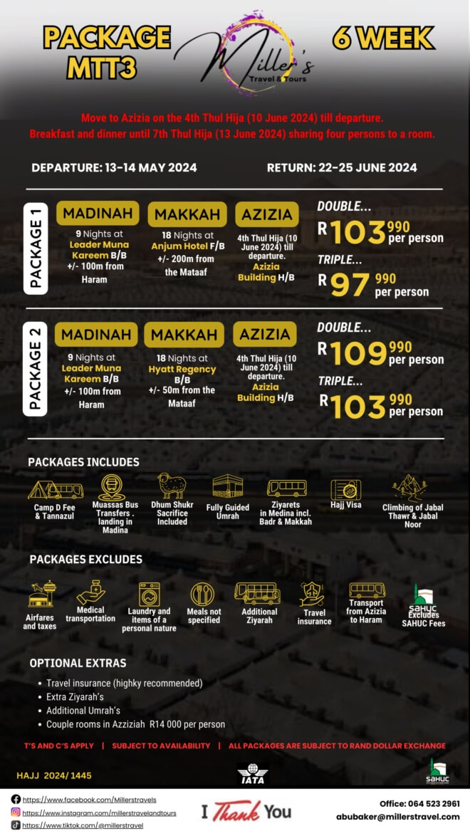 Disclaimer: Kindly check and confirm details with operators before booking. Package Information has been uploaded onto our website as received, and may have changed. Hotel Information has been sourced from websites like Google Maps, Wikimapia and Hotels.com. If any of the information is incorrect, kindly let us know via email: info@hajjumrahinfo.co.za - Shukran