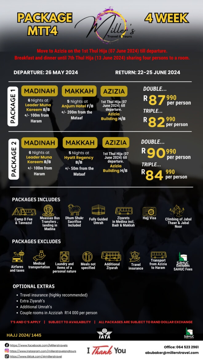 Disclaimer: Kindly check and confirm details with operators before booking. Package Information has been uploaded onto our website as received, and may have changed. Hotel Information has been sourced from websites like Google Maps, Wikimapia and Hotels.com. If any of the information is incorrect, kindly let us know via email: info@hajjumrahinfo.co.za - Shukran