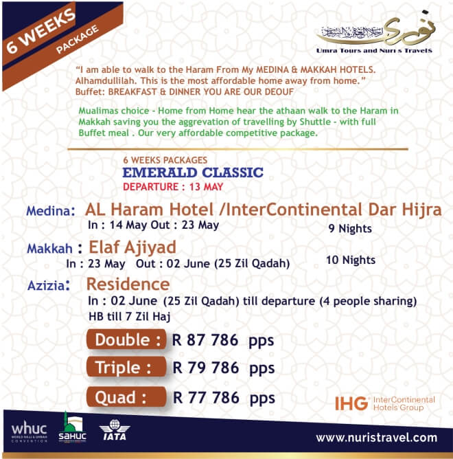 Disclaimer: Kindly check and confirm details with operators before booking. Package Information has been uploaded onto our website as received, and may have changed. Hotel Information has been sourced from websites like Google Maps, Wikimapia and Hotels.com. If any of the information is incorrect, kindly let us know via email: info@hajjumrahinfo.co.za - Shukran