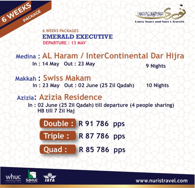 Disclaimer: Kindly check and confirm details with operators before booking. Package Information has been uploaded onto our website as received, and may have changed. Hotel Information has been sourced from websites like Google Maps, Wikimapia and Hotels.com. If any of the information is incorrect, kindly let us know via email: info@hajjumrahinfo.co.za - Shukran