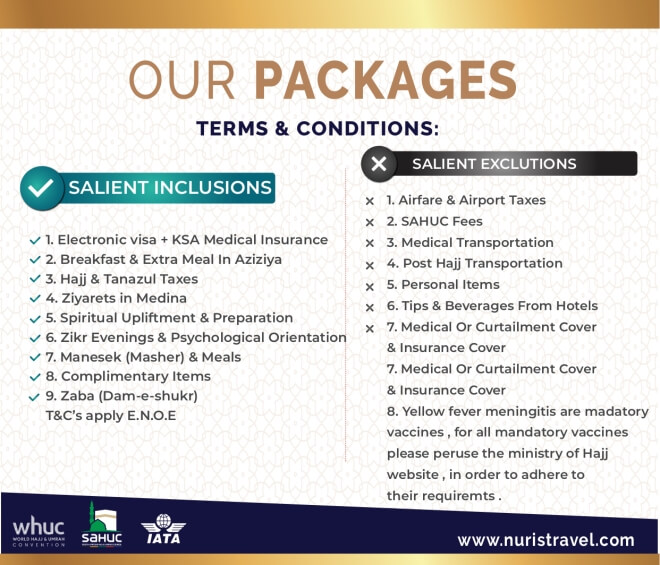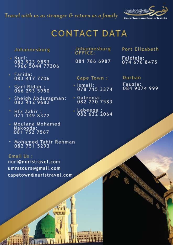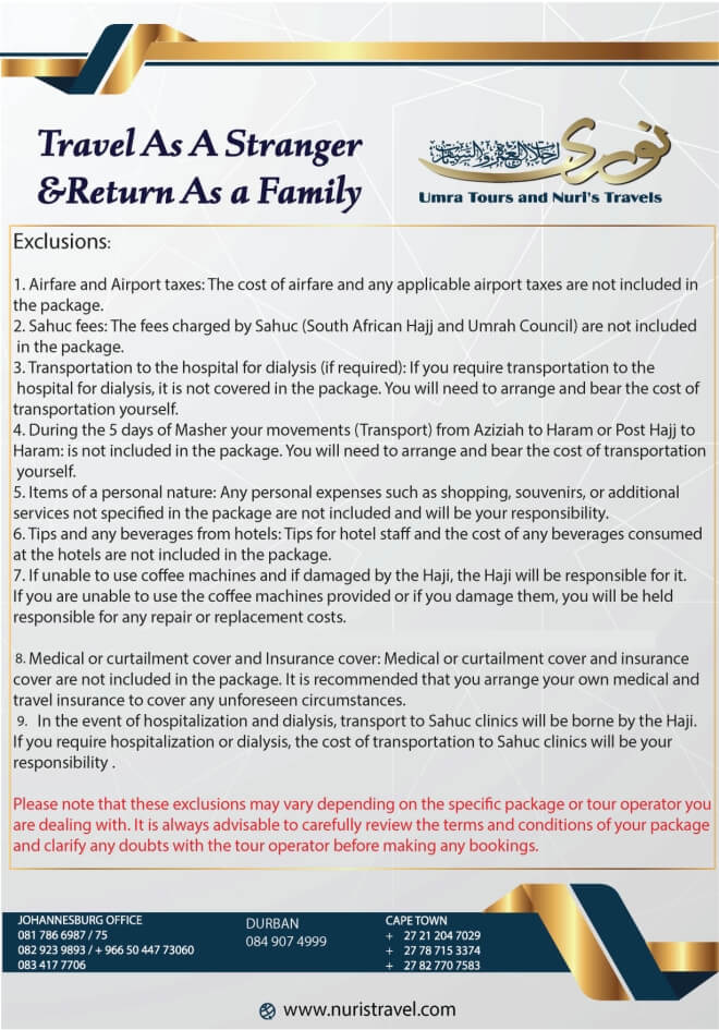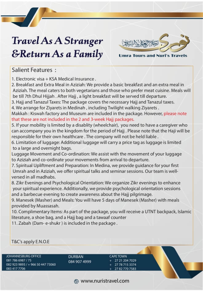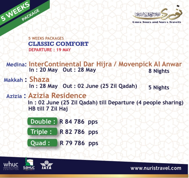 Disclaimer: Kindly check and confirm details with operators before booking. Package Information has been uploaded onto our website as received, and may have changed. Hotel Information has been sourced from websites like Google Maps, Wikimapia and Hotels.com. If any of the information is incorrect, kindly let us know via email: info@hajjumrahinfo.co.za - Shukran