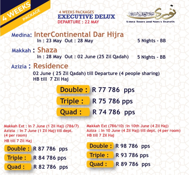 Disclaimer: Kindly check and confirm details with operators before booking. Package Information has been uploaded onto our website as received, and may have changed. Hotel Information has been sourced from websites like Google Maps, Wikimapia and Hotels.com. If any of the information is incorrect, kindly let us know via email: info@hajjumrahinfo.co.za - Shukran