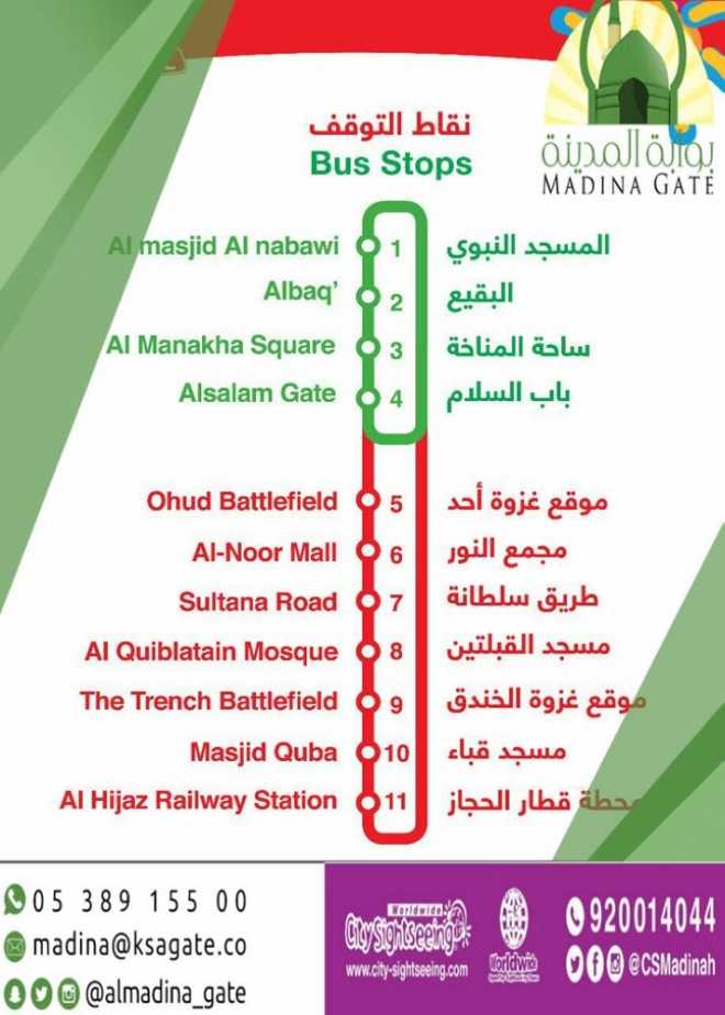 The 11 sights that the buses stop at include: the Holy Mosque, Al-Baqi, Al-Manakha Open Area, Al-Salam Gate, Uhad Mosque, Al-Nour Mall, Sultana Shopping Street, Al-Qiblatain Mosque, Seven Mosques near the location of the Battle of the Trench, Quba Mosque and Hijaz Railway Station.
