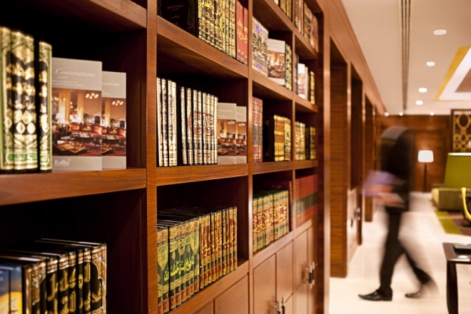 More than 145 different books and arts shine bright at one corner of the Raffles Makkah Hotel, directly adjacent to the Grand Mosque, a sight that still attracts the attention of everyone who enters and sees the hotel library.
