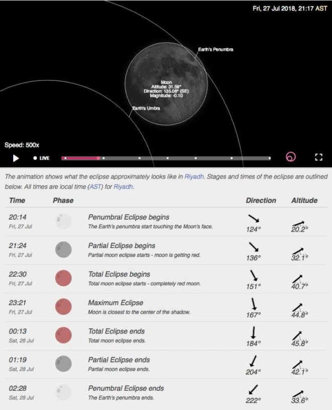 In Jeddah and Riyadh, the penumbral eclipse will begin at 8:14 p.m. on Friday, total eclipse will begin at 10:30 p.m., at 12:13 a.m. Saturday total eclipse will end and at 2:28 a.m. on Saturday penumbral eclipse will end. The total duration of the various stages of eclipse will be 6 hours, 14 minutes in the Kingdom.