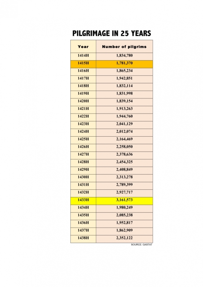 Source: http://saudigazette.com.sa/article/540787/SAUDI-ARABIA/Kingdom-served-54-million-Haj-pilgrims-over-25-years-GaStat