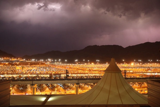 Pilgrims who journeyed from Mina watched the night sky light up with flashes of lightning, as they prepared for a day of prayer and devotion on the Arafat plain on Monday.