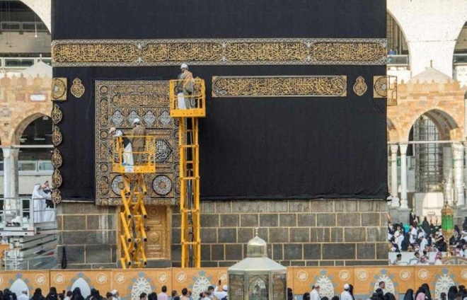 In the beginning, the old kiswa was taken off and was installed with the new one, which is made of pure silk and gold threads. The kiswa, which is considered one of the most exquisite works of Islamic art, is made of five pieces. The fifth piece is the curtain of Kaaba’s door. Nearly 670 kilograms of natural silk, 120 kilos of gold and 100 kilos of silver were used to make the kiswa. Its total weight is 1,150 kilos, and 23 highly advanced machines were used in making it. The kiswa was designed and tailored by more than 200 Saudi employees at a special factory set up by the Kingdom for the purpose in Umm Al-Joud neighborhood in Makkah.