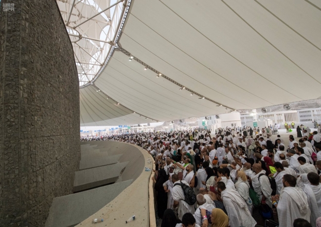 The stoning ritual area is on a multi-level structure that surrounds the pillars with a walkway to and away the site to ensure the safety of the millions of pilgrims.