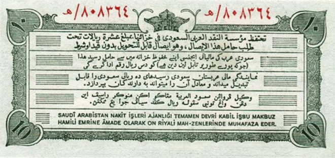 The first batch of 5 million were printed in Arabic, Persian, English, Urdu, Turkish and Malayan. Pilgrims welcomed the new paper currency and it quickly became widely accepted throughout the Kingdom.