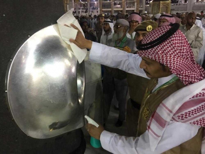 "Before each prayer every day, the Hijr Ismail, the entire area around the Kaaba and Al-Multazim (the area between the Black Stone and the Kaaba door) are sterilized by disinfectants, cleaned and perfumed," said Hassan Al-Zowiahri of the presidency.