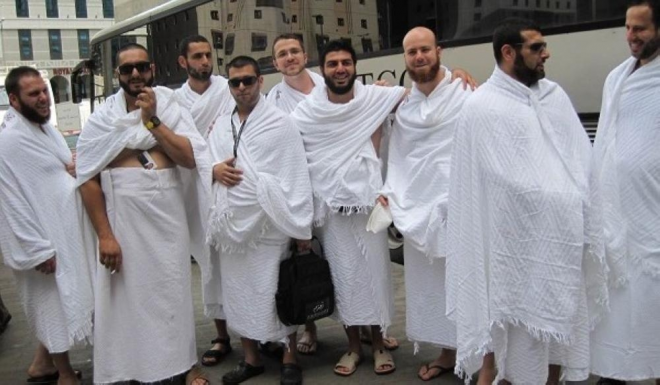 Ihram is a state of consecration a pilgrim is in during the Haj and Umrah. Before entering ihram, male pilgrims are obliged to wear only two pieces of un-hemmed sheets.