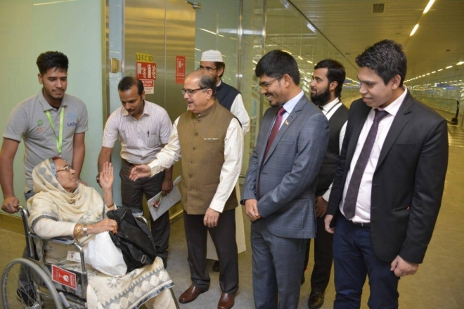 Indian Ambassador Dr. Ausaf Sayeed, Consul General Md. Noor Rahman Sheikh and Haj Consul Y. Sabir received the pilgrims on arrival at the airport.