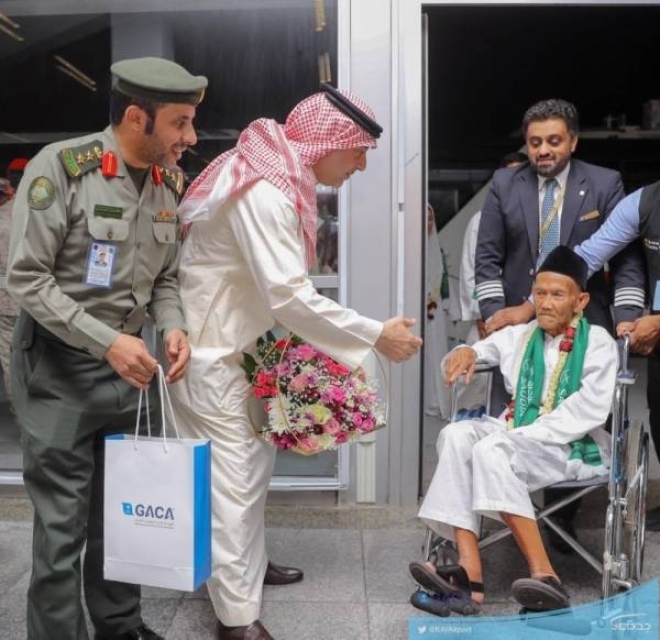 In Jeddah, the aged pilgrim was accorded a warm welcome from senior Saudi officials and the airport staff.