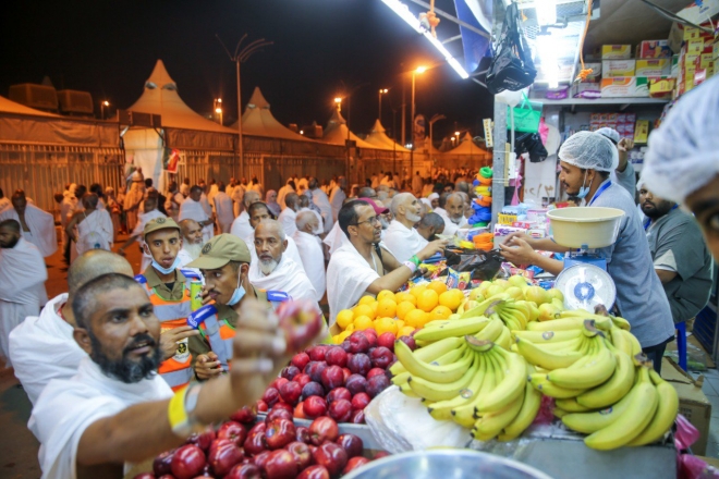 Night falls on the tents hosting pilgrims in Mina for Hajj ahead of the journey to Mount Arafat on Saturday.