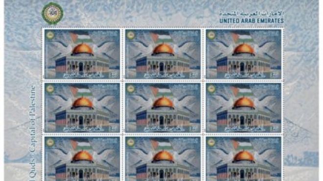 Emirates Post issued a commemorative stamp in support of Palestine featuring the Dome of the Rock, and stresses that Jerusalem al-Quds is the capital of Palestine.