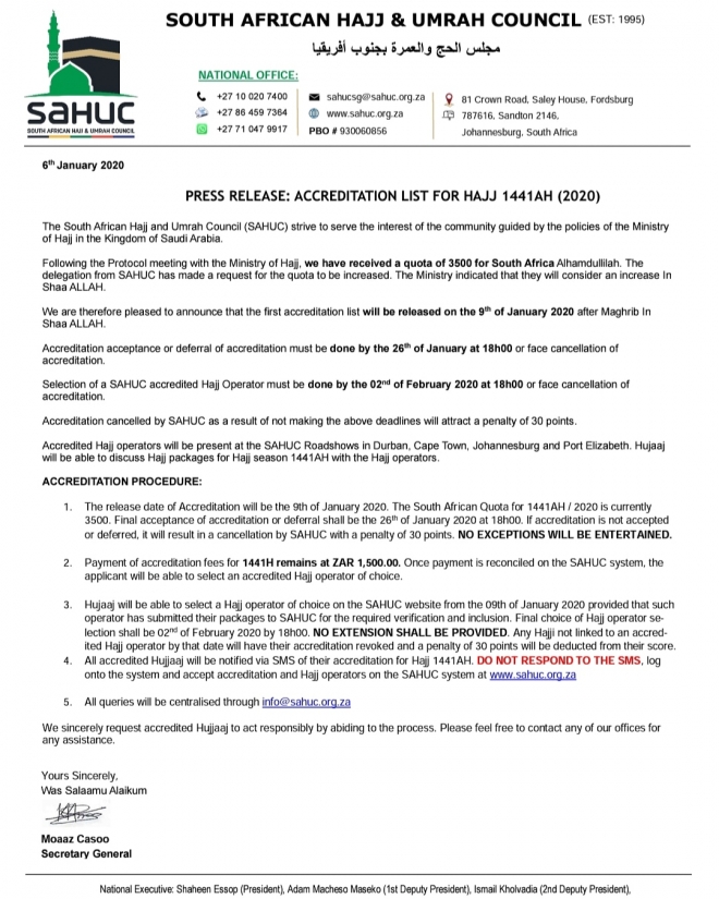The South African Hajj Umrah Council (SAHUC) has announced that it will release its first accreditation list for Hajj1441/2020 on 9 January.