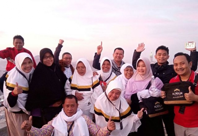 Indonesian pilgrims pose for a photo during the umrah or the minor pilgrimage to the holy city Mecca. (Photo courtesy of Umroh.com)
