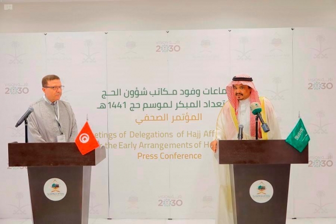 Later, the Minister of Hajj and Umrah and the Tunisian Minister of Religious Affairs signed an agreement for arranging Hajj affairs for the Hajj season 1441H. The agreement aims to organize the arrival of pilgrims coming from the Republic of Tunisia and all their requirements through service agencies participating in the pilgrims services system during their stay in the Holy Sites to perform Hajj rituals.
