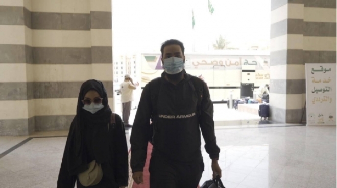 At the lobby of the hotel, Muhammad walks a little and gets his temperature checked before his wife, and after then, he refers to his wife, the companion of the journey, who in turn expressed her joy: “We are performing the first pilgrimage in the first year of our marriage as if it is a gift for our partnership. I feel extremely delighted and I can’t find words to express my feelings,” she remarked.