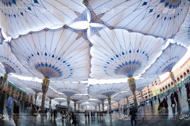 As part of the umbrellas project, 436 misting fans have been installed on 250 umbrellas covering the various squares of the mosque, which have an area of about 175,500 sq. meters and accommodate approximately 251,000 worshipers.