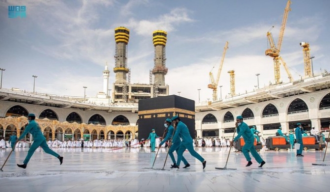 During the last Islamic month, 300 washing and disinfection operations were carried out at the Grand Mosque and its courtyards using 2,400,000 liters of high-quality disinfectant and cleaning products.