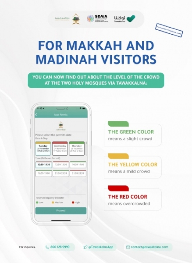 - Colored indicators added to Eatmarna, Tawakkalna apps to avoid congestion at Two Holy Mosques
