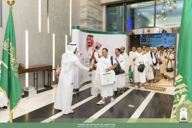 Upon their arrival at their places of residence in Makkah, the pilgrims were welcomed with flowers, Zamzam, dates and Saudi coffee.