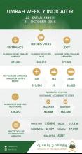 The Ministry of Haj and Umrah has said 835,910 visas were issued for Umrah pilgrims (mutamirs) until Wednesday, Oct. 31. It said 547,392 pilgrims already arrived in the Kingdom since the beginning of the current Umrah season and 271,020 of them have left Saudi Arabia after completing the ritual.