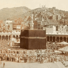 Pilgrims surround the Ka'bah and all face it while some perform the tawaf. Buildings line the hills of the holy mountain Jebel Abu Qubays in the background and up top, the white walls and minaret of the Bilal Mosque can be seen. Have you ever looked around a bustling city and wondered what it was like before all the glass and steel, before all the skyscrapers – and especially in a city of immense importance like the holy city of Mecca?