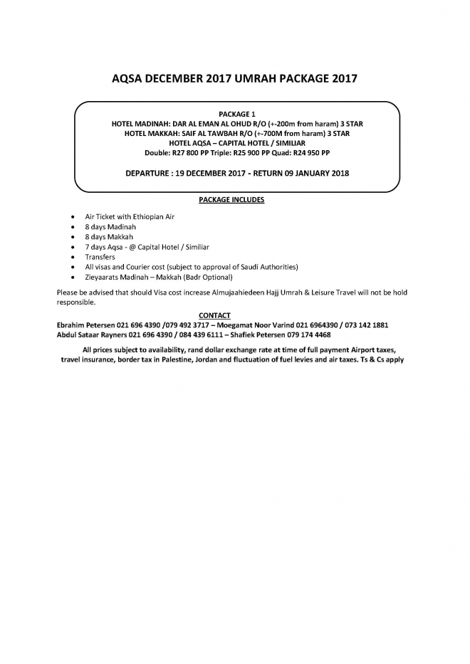 Disclaimer: Kindly check and confirm details with operators before booking. Package Information has been uploaded onto our website as received, and may have changed. Hotel Information has been sourced from websites like Google Maps, Wikimapia and Hotels.com. If any of the information is incorrect, kindly let us know via email: info@hajjumrahinfo.co.za - Shukran