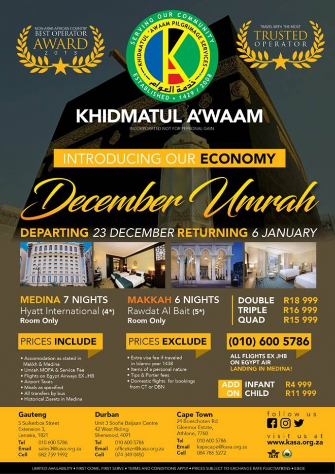 Disclaimer: Kindly check and confirm details with operators before booking. Package Information has been uploaded onto our website as received, and may have changed. Hotel Information has been sourced from websites like Google Maps, Wikimapia and Hotels.com. If any of the information is incorrect, kindly let us know via email: info@hajjumrahinfo.co.za - Shukran