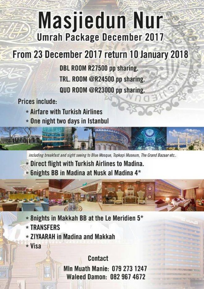 Disclaimer: Kindly check and confirm details with operators before booking. Package Information has been uploaded onto our website as received, and may have changed. Hotel Information has been sourced from websites like Google Maps, Wikimapia and Hotels.com. If any of the information is incorrect, kindly let us know via email: info@hajjumrahinfo.co.za - Shukran