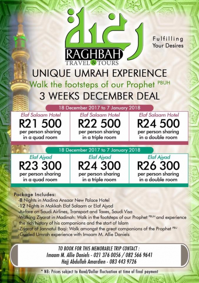 Disclaimer: Kindly check and confirm details with operators before booking. Package Information has been uploaded onto our website as received, and may have changed. Hotel Information has been sourced from websites like Google Maps, Wikimapia and Hotels.com. If any of the information is incorrect, kindly let us know via email: info@hajjumrahinfo.co.za - Shukran