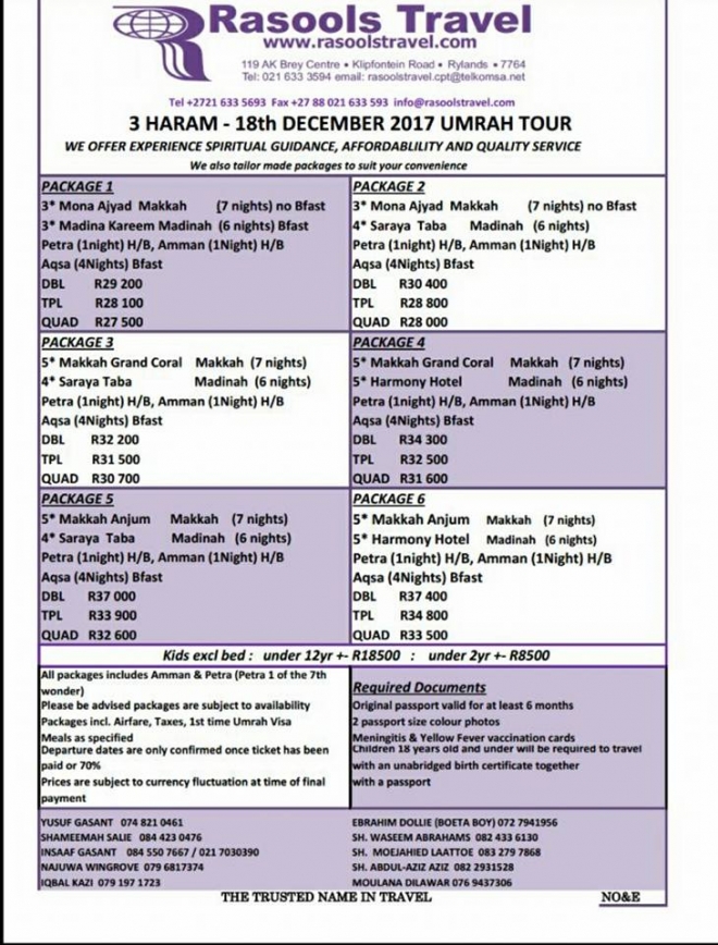 Disclaimer: Kindly check and confirm details with operators before booking. Package Information has been uploaded onto our website as received, and may have changed. Hotel Information has been sourced from websites like Google Maps, Wikimapia and Hotels.com. If any of the information is incorrect, kindly let us know via email: info@hajjumrahinfo.co.za - Shukran
