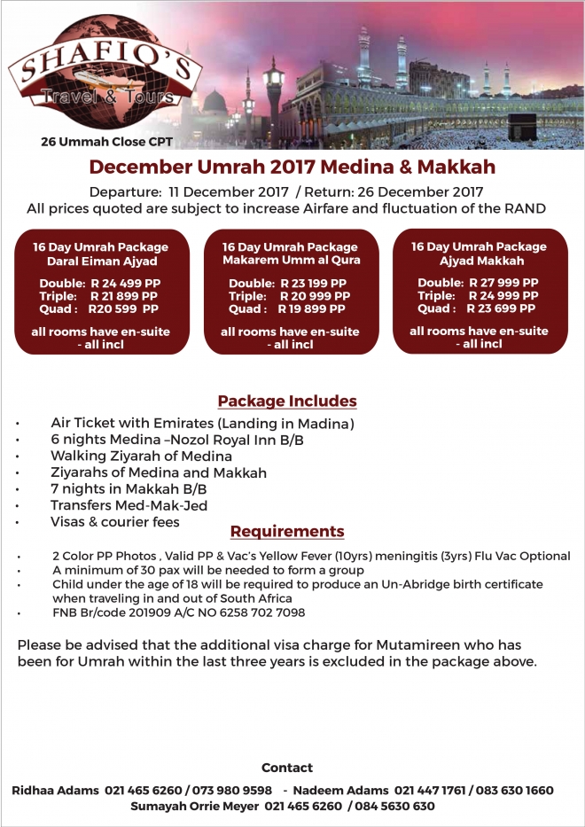 Disclaimer: Kindly check and confirm details with operators before booking. Package Information has been uploaded onto our website as received, and may have changed. Hotel Information has been sourced from websites like Google Maps, Wikimapia and Hotels.com. If any of the information is incorrect, kindly let us know via email: info@hajjumrahinfo.co.za - Shukran