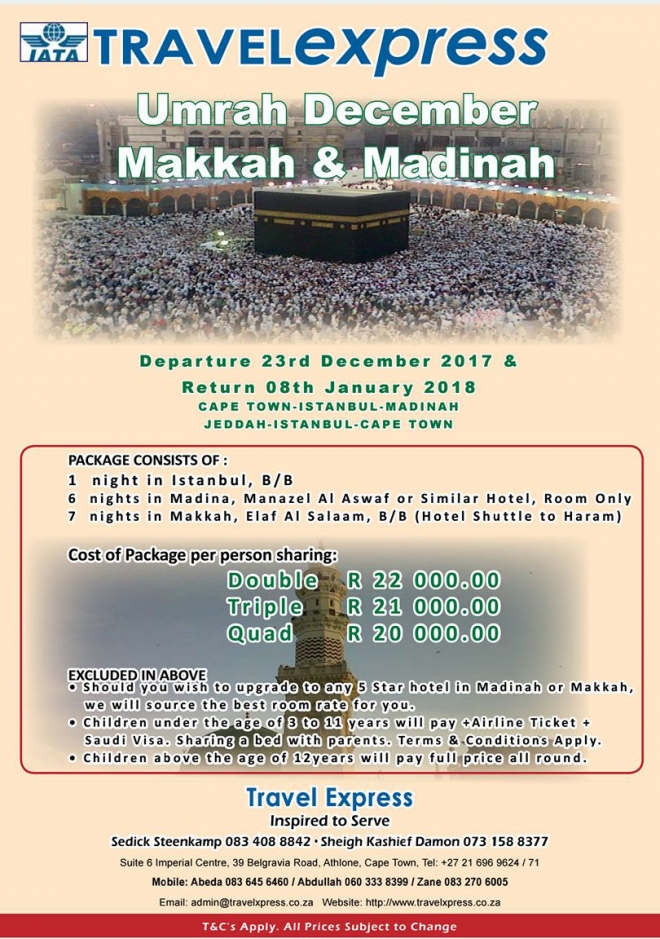 Disclaimer: Kindly check and confirm details with operators before booking. Package Information has been uploaded onto our website as received, and may have changed. Hotel Information has been sourced from websites like Google Maps, Wikimapia and Hotels.com. If any of the information is incorrect, kindly let us know via email: info@hajjumrahinfo.co.za - Shukran