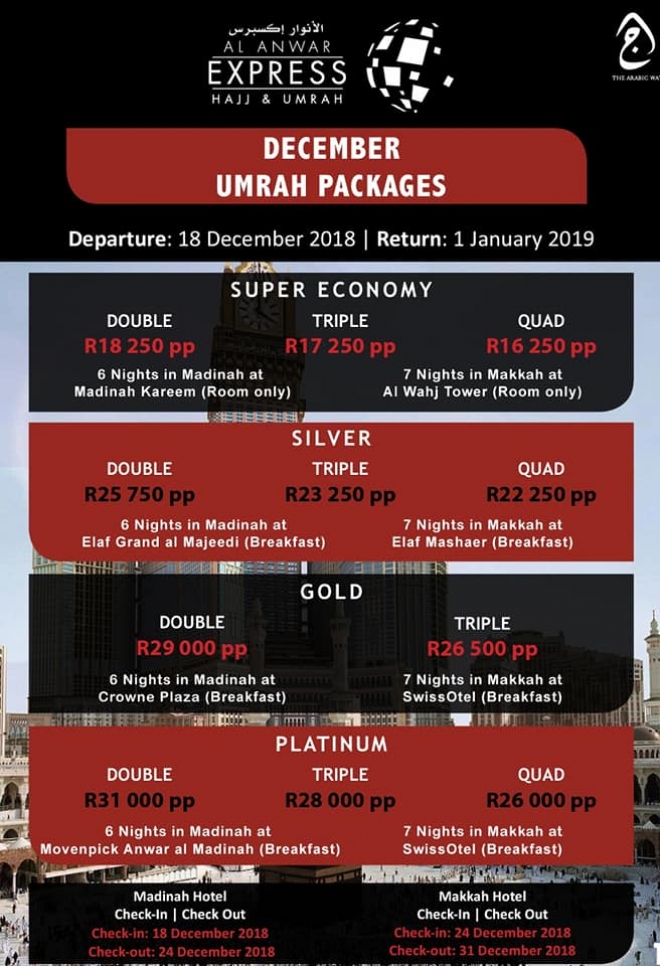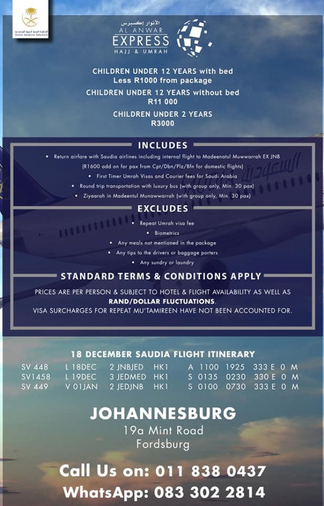 Disclaimer: Kindly check and confirm details with operators before booking. Package Information has been uploaded onto our website as received, and may have changed. Hotel Information has been sourced from websites like Google Maps, Wikimapia and Hotels.com. If any of the information is incorrect, kindly let us know via email: info@hajjumrahinfo.co.za - Shukran