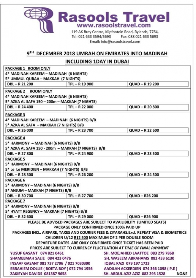 Disclaimer: Kindly check and confirm details with operators before booking. Package Information has been uploaded onto our website as received, and may have changed. Hotel Information has been sourced from websites like Google Maps, Wikimapia and Hotels.com. If any of the information is incorrect, kindly let us know via email: info@hajjumrahinfo.co.za - Shukran