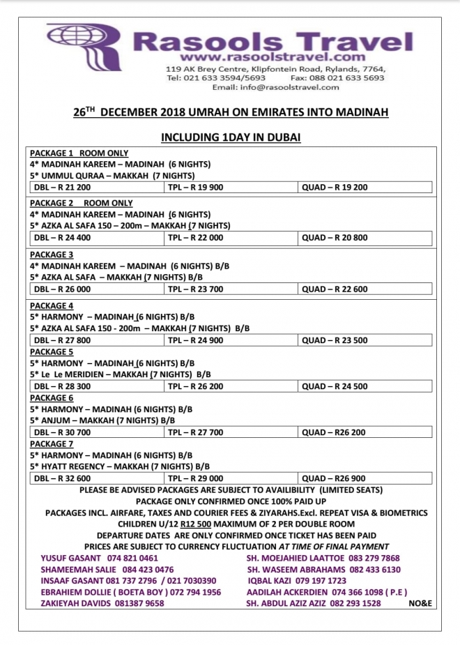 Disclaimer: Kindly check and confirm details with operators before booking. Package Information has been uploaded onto our website as received, and may have changed. Hotel Information has been sourced from websites like Google Maps, Wikimapia and Hotels.com. If any of the information is incorrect, kindly let us know via email: info@hajjumrahinfo.co.za - Shukran