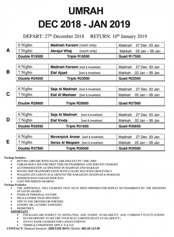 Source: http://www.shaheedhajj.co.za/umrah2018.html