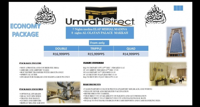 Disclaimer: Kindly check and confirm details with operators before booking. Package Information has been uploaded onto our website as received, and may have changed. Hotel Information has been sourced from websites like Google Maps, Wikimapia and Hotels.com. If any of the information is incorrect, kindly let us know via email: info@hajjumrahinfo.co.za - Shukran