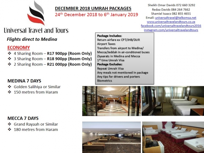 Disclaimer: Kindly check and confirm details with operators before booking. Package Information has been uploaded onto our website as received, and may have changed. Hotel Information has been sourced from websites like Google Maps, Wikimapia and Hotels.com. If any of the information is incorrect, kindly let us know via email: info@hajjumrahinfo.co.za - Shukran