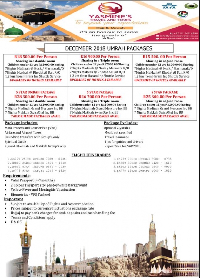 Disclaimer: Kindly check and confirm details with operators before booking. Package Information has been uploaded onto our website as received, and may have changed. Hotel Information has been sourced from websites like Google Maps, Wikimapia and Hotels.com. If any of the information is incorrect, kindly let us know via email: info@hajjumrahinfo.co.za - Shukran