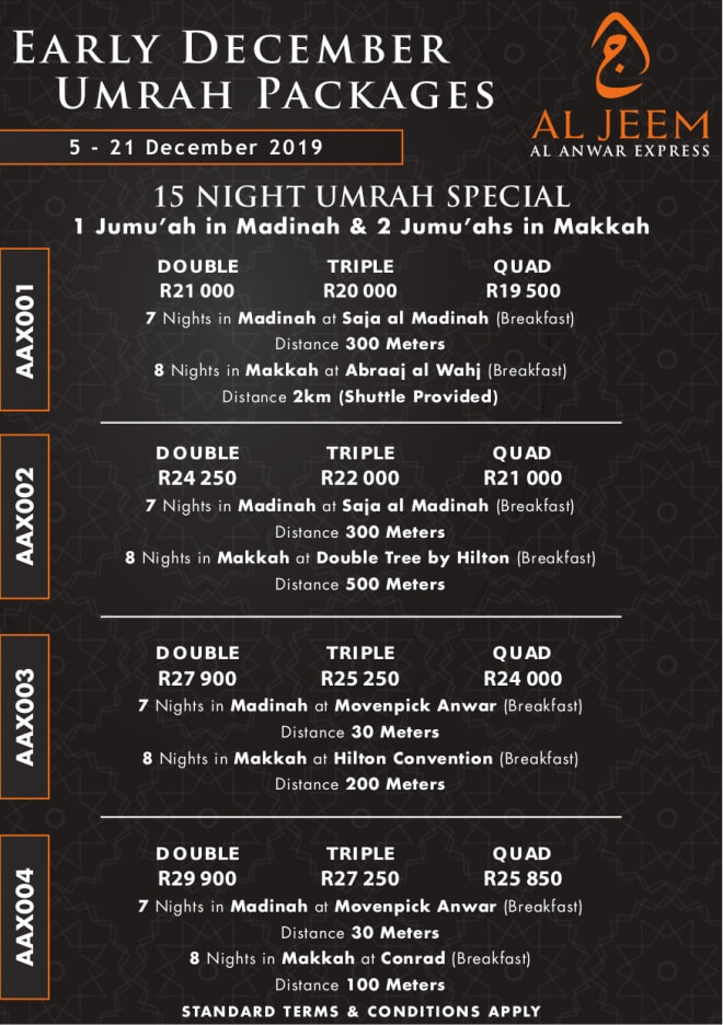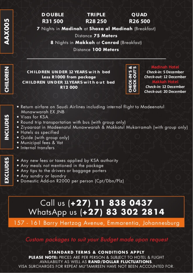 Disclaimer: Kindly check and confirm details with operators before booking. Package Information has been uploaded onto our website as received, and may have changed. Hotel Information has been sourced from websites like Google Maps, Wikimapia and Hotels.com. If any of the information is incorrect, kindly let us know via email: info@hajjumrahinfo.co.za - Shukran