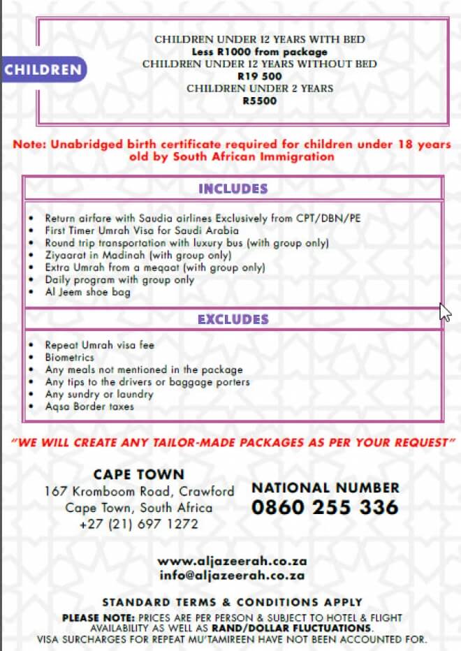 Disclaimer: Kindly check and confirm details with operators before booking. Package Information has been uploaded onto our website as received, and may have changed. Hotel Information has been sourced from websites like Google Maps, Wikimapia and Hotels.com. If any of the information is incorrect, kindly let us know via email: info@hajjumrahinfo.co.za - Shukran
