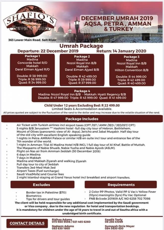 Disclaimer: Kindly check and confirm details with operators before booking. Package Information has been uploaded onto our website as received, and may have changed. Hotel Information has been sourced from websites like Google Maps, Wikimapia and Hotels.com. If any of the information is incorrect, kindly let us know via email: info@hajjumrahinfo.co.za - Shukran