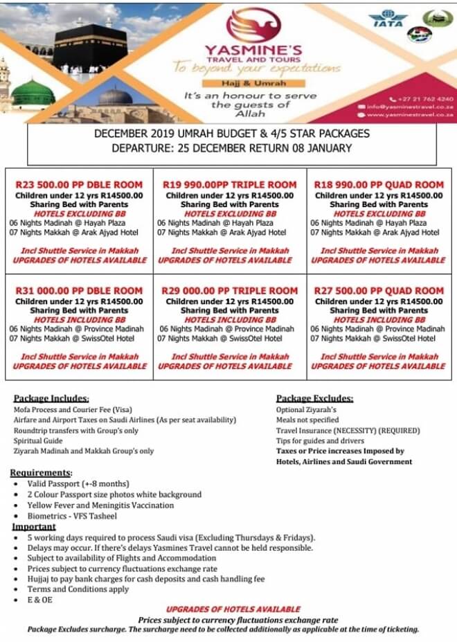 Yasmines Travel - December 2019 Umrah 4/5 Star Package