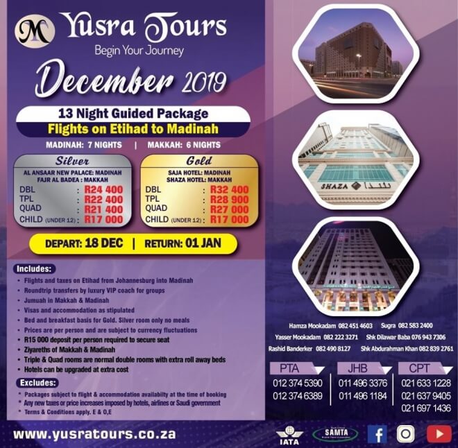 Disclaimer: Kindly check and confirm details with operators before booking. Package Information has been uploaded onto our website as received, and may have changed. Hotel Information has been sourced from websites like Google Maps, Wikimapia and Hotels.com. If any of the information is incorrect, kindly let us know via email: info@hajjumrahinfo.co.za - Shukran