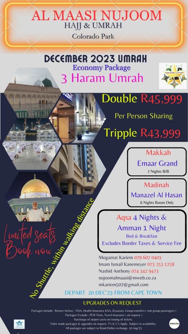 Disclaimer: Kindly check and confirm details with operators before booking. Package Information has been uploaded onto our website as received, and may have changed. Hotel Information has been sourced from websites like Google Maps, Wikimapia and Hotels.com. If any of the information is incorrect, kindly let us know via email: info@hajjumrahinfo.co.za - Shukran